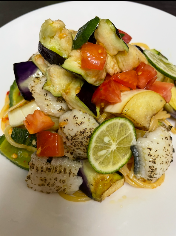 彩り野菜をたっぷり使った「炙り鱧と旬野菜のオイルパスタ」